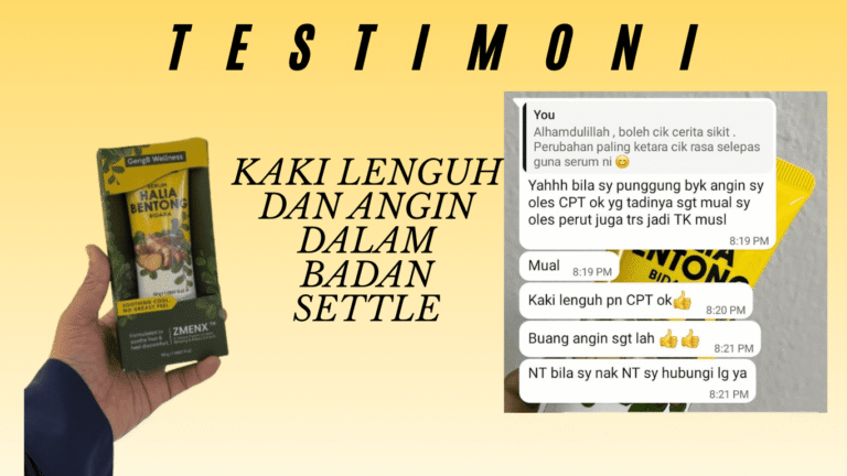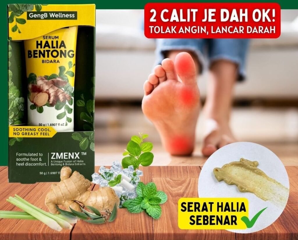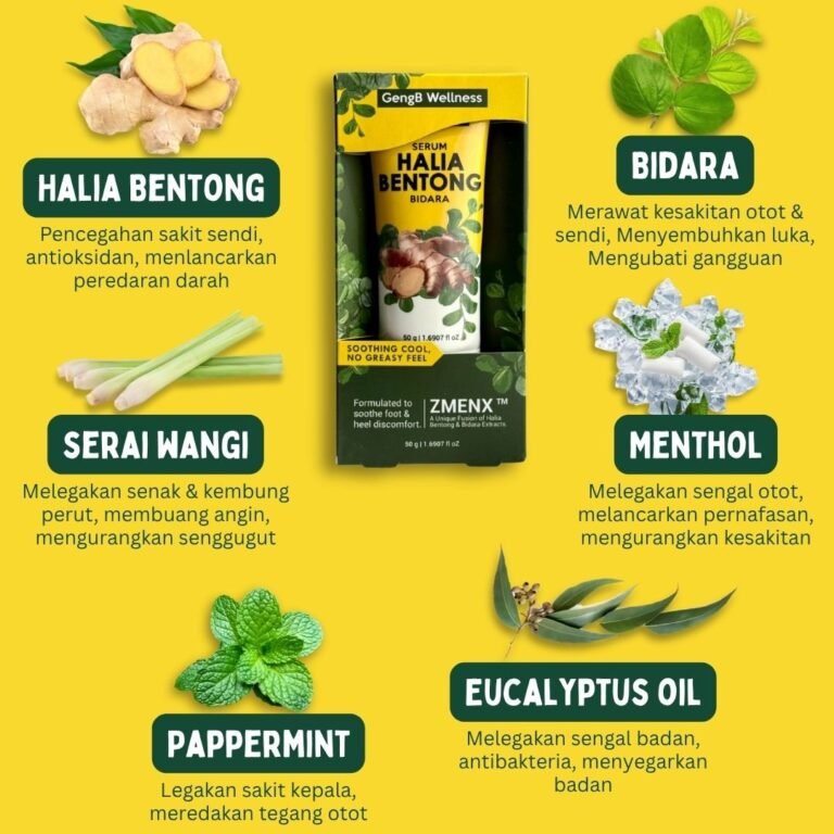 Ekstrak Bahan Semula Jadi Premium SERUM HALIA BENTONG – ZMENX iaitu Halia Bentong & Ekstrak Bidara kaya dengan bahan aktif yang membantu membantu atasi sakit badan khususnya Sakti Tumit & Kebas-Kebas Badan.
