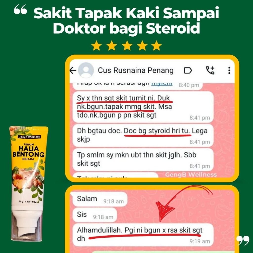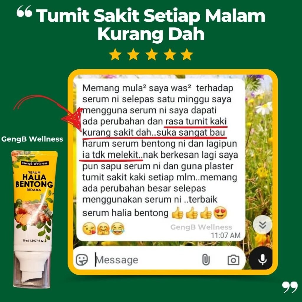 *untuk yang telah mengidap SAKIT TUMIT LEBIH DARI 1 TAHUN disarankan untuk guna SERUM HALIA BENTONG setiap hari selama 14 hari untuk permulaan. Lihat perubahan positif setiap hari. Rekod & tangkap kawasan sakit dan lihat perubahan seperti surut pembengkakan untuk lihat perbezaan sebelum selepas menggunakan SERUM HALIA BENTONG